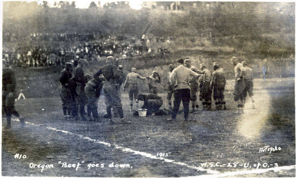 ![]() An injured Oregon player is attended to during the game. WSC wore the light striped jerseys. (WSC Digital Libraries) The next play was a sweep intended to pit the bigger Oregon linemen against smaller defenders. But the Warrior linemen held their counterparts in place on the line of scrimmage. As the backs sprinted to the side, they were met by the speedy WSC linebackers and secondary. As the Webfoots fullback leading the interference prepared to block the nearest defender, RHB Dick Hanley, his target dropped to the ground and rolled into the fullback's legs, sending him sprawling. Hanley immediately hopped to his feet and tackled the ball carrier.