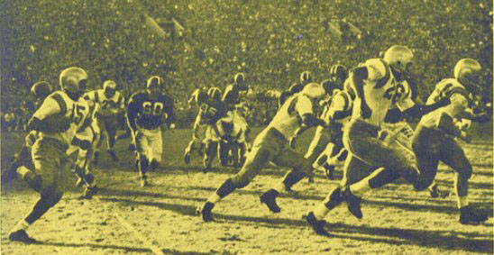 ![]() ![]() L: Red Sanders and Duffy Daugherty look in a crystal ball to determine Rose Bowl winner. (Michigan State University Red Cedar Log Yearbook Class of 1956) R: UCLA runner tries to vault over the line. (UCLA Bruin Life Southern Campus Yearbook - Class of 1956) UCLA Scores First