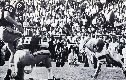 ![]() ![]() L: Bill Bates kicks a Missouri field goal. R: HB Earl Denny runs for Missouri. (University of Missouri Savitar Yearbook Class of 1966) The comeback started with 13:42 left in the game. With Missouri ahead 20-0 and facing a fourth-and-one situation on the Florida 14, it appeared the Tigers had the victory locked in a burglar-proof safe. But the Gators swamped QB Gary Lane for no gain on a sneak.