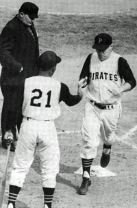 ![]() ![]() ![]() ![]() L-R: Clemente and Groat greet Smith after his home run; Bob Friend; Harvey Haddix; Bill Terry Mel Allen on the TV broadcast: "The fans go wild in Pittsburgh as Hal Smith slams a long drive 425' over the left field wall scoring Groat and Clemente ahead of him. ... One of the most dramatic base hits in the history of the World Series. ... That base hit will long be remembered."