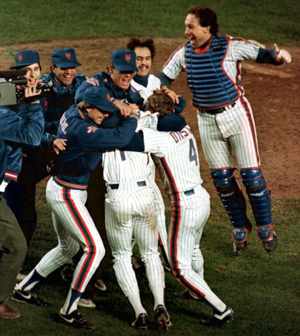 ![]() ![]() Mets mob Mookie. "I'm sitting here and I still don't believe it." That's the way sportswriter Bus Saidt started his story of the game for the Trenton Times. Ray Sons, Chicago Sun-Times: "Bill Buckner has just limped off the field, carrying the weight of the world on his back. He can ice those aching ankles all night so he can play in Game Seven of the World Series tonight, but there isn't enough ice to freeze the pain in his heart." Kevin Modesti, L.A. Daily News: "If the Red Sox couldn't win their first World Series in 68 years after leading ... by two runs ... with two out ... and the bases empty in the bottom of the 10th inning of Saturday's sixth game, well, maybe it's impossible after all." Jayson Stark, Philadelphia Inquirer: "It was enough to make you believe there are curses that haunt this team. It was enough to make you believe that the Mets are on some highway toward destiny." In Game 7, the Red Sox built a 3-0 lead into the bottom of the sixth. But the Mets bats came to life and scored eight runs over the next three innings for an 8-5 Series-clinching victory. Red Sox fans would have to wait until 2004 to finally win the World Series and end the "Curse of the Bambino" jinx.